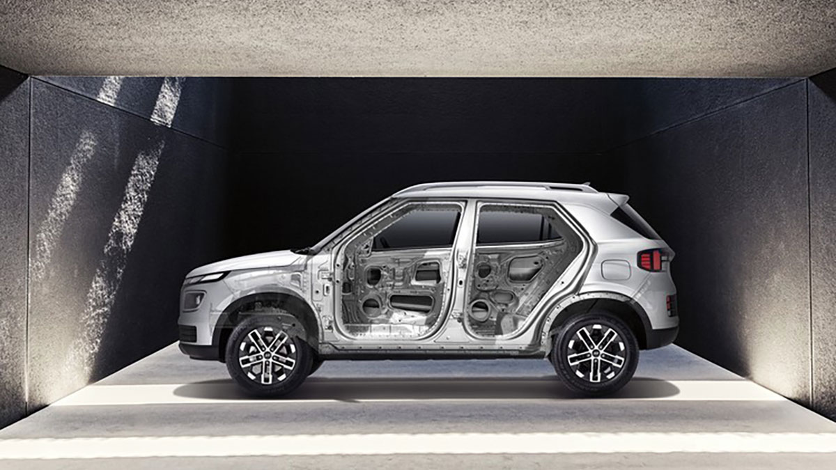 Venue được trang bị hệ thống khung xe với vật liệu chịu lực cao, được bổ sung thêm thành phần thép cường lực AHSS tới 65%, giúp hấp thụ lực tác động trong tình huống va chạm, đảm bảo an toàn cho toàn bộ hành khách ngồi trong xe.